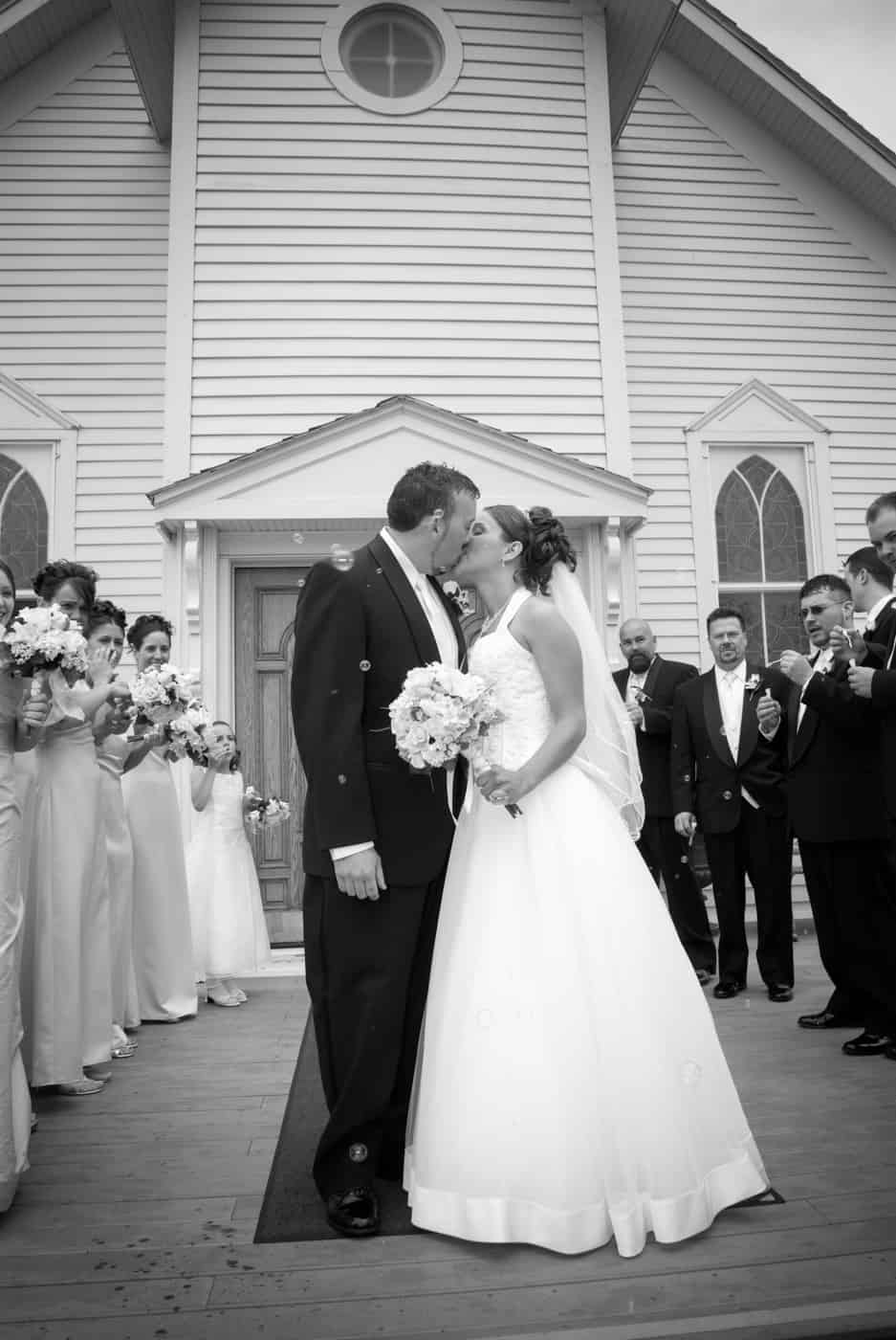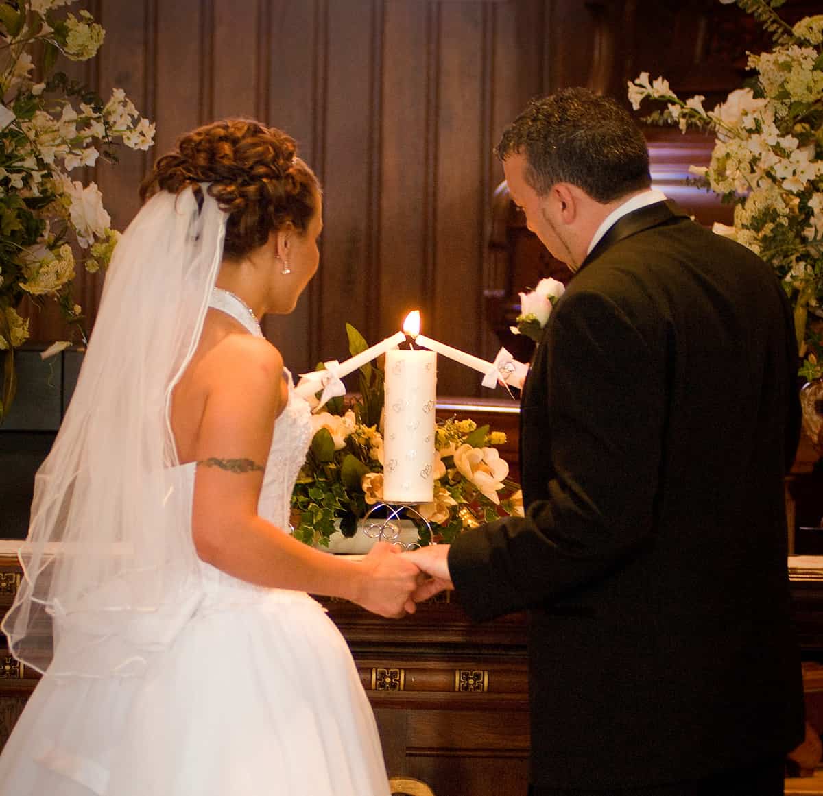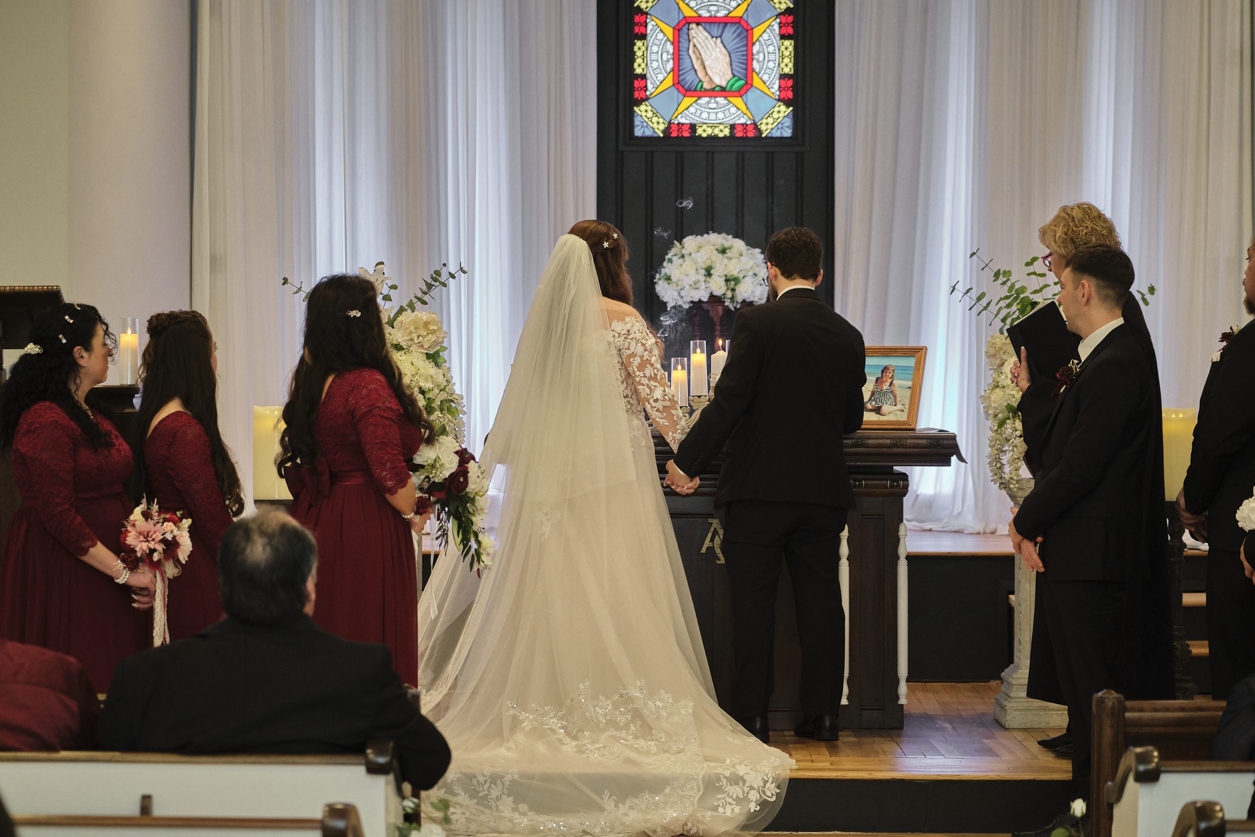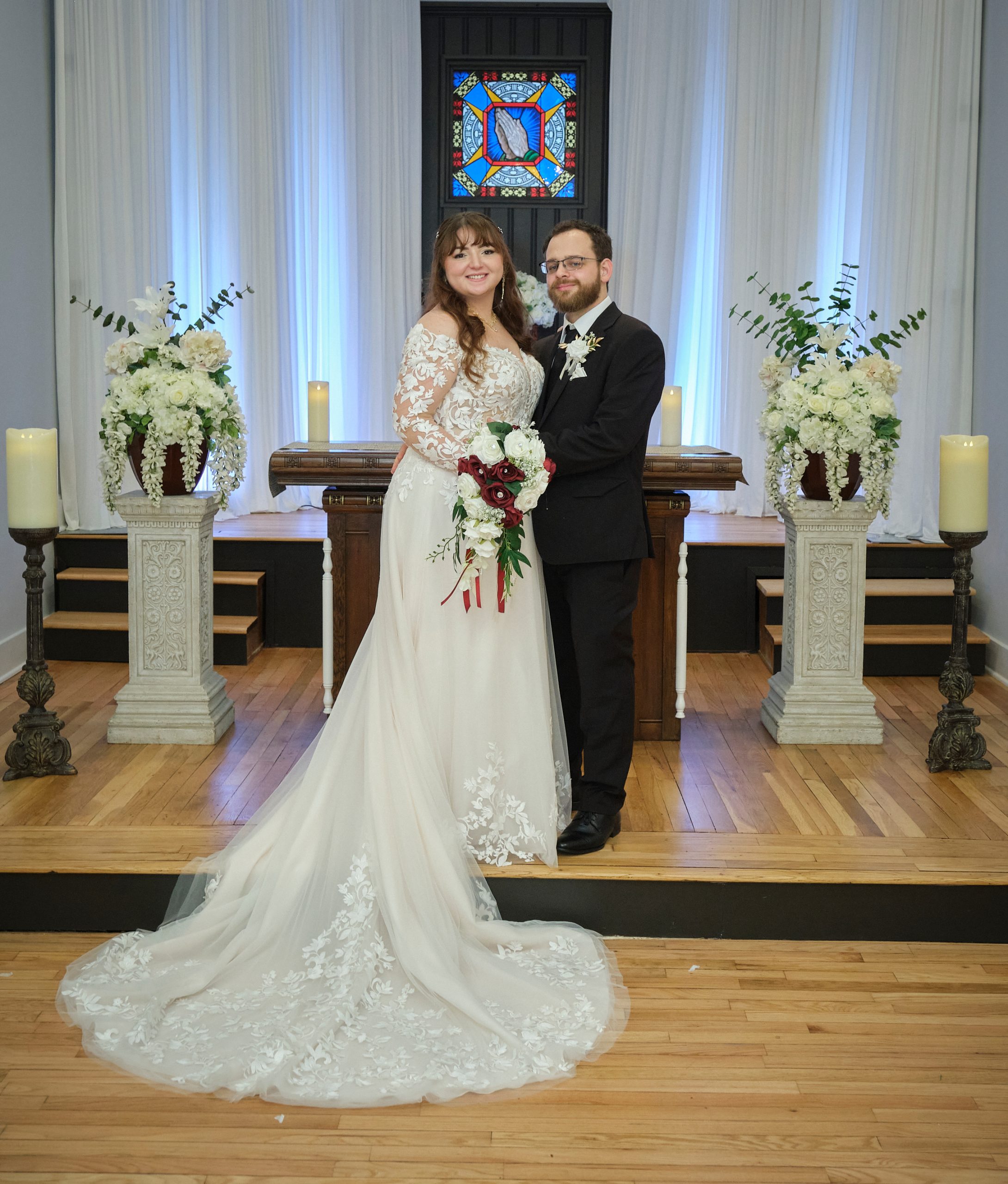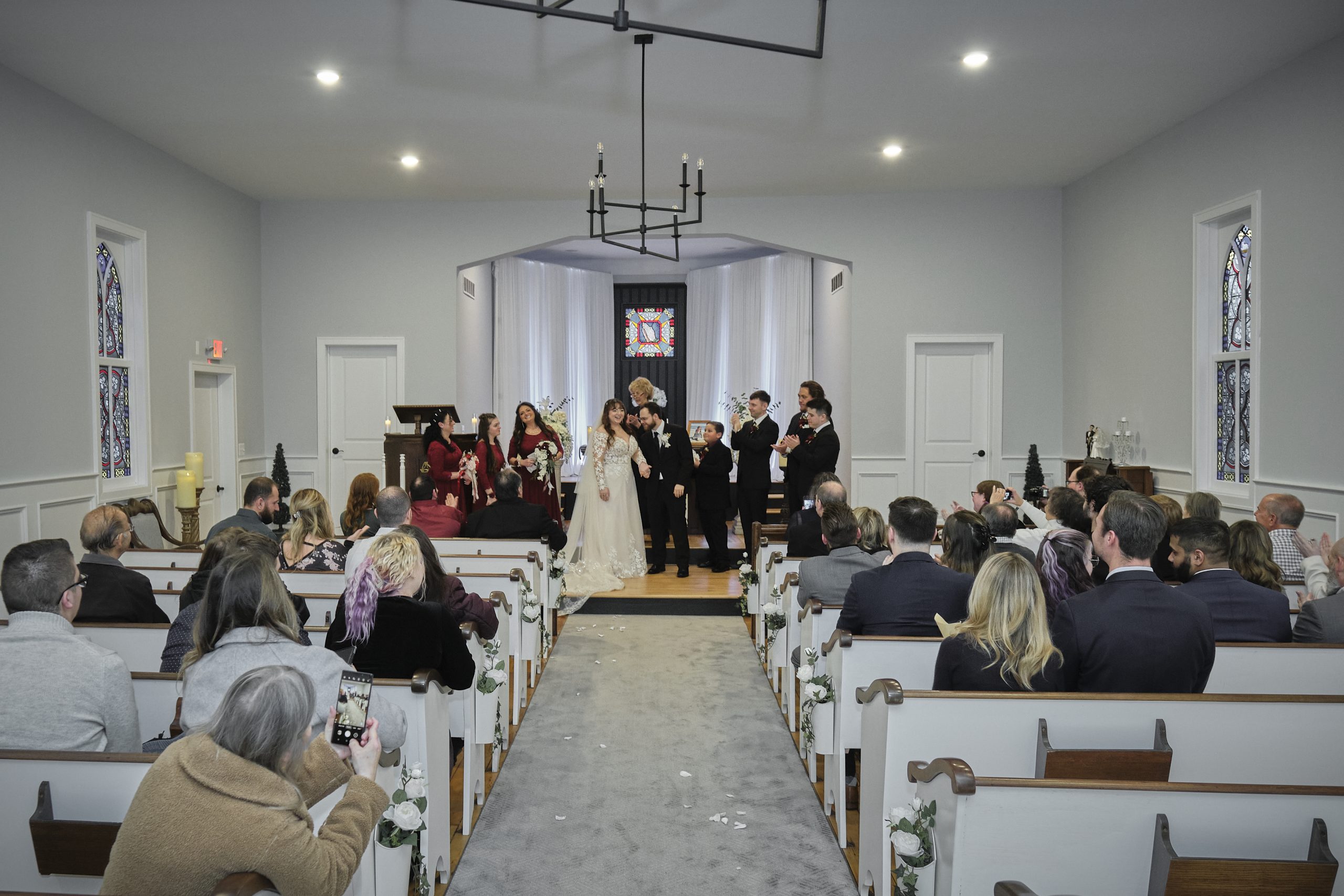 Guests enter the church through double doors as colorful lights dance and flicker on the walls and ceiling with rays of sunlight streak through Grisaille stained glass windows. The natural pine wood work and floor of the church are original. The church is adorned with white antique pews trimmed in walnut and embellished with white roses and greenery down the aisle. The alter and furniture are solid cherry wood and the black walnut lectern is accented with leaf-motif carvings. The romantic setting is an inspired blend of timeless tradition, intimacy and elegant charm.